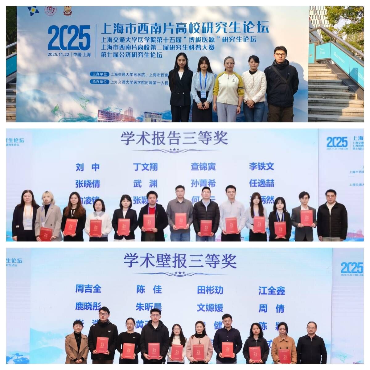 2025年11月22日,上海市西南片区高校研究生论坛暨上海交通大学医学院第十五届“博极医源”研究生论坛、第七届公济研究生学术论坛在上海市第一人民医院隆重举行。来自上海交通大学医学院、江南大学、蚌埠医科大学、遵义医科大学共计300余位师生参会。我校认真组织,积极动员,研究生共投稿32篇,经过现场评审,研究生何云获得学术报告三等奖,鹿晓彤获得学术壁报三等奖,张世晴、谢苗苗、杜崇利三位同学获得学术壁报优胜奖。