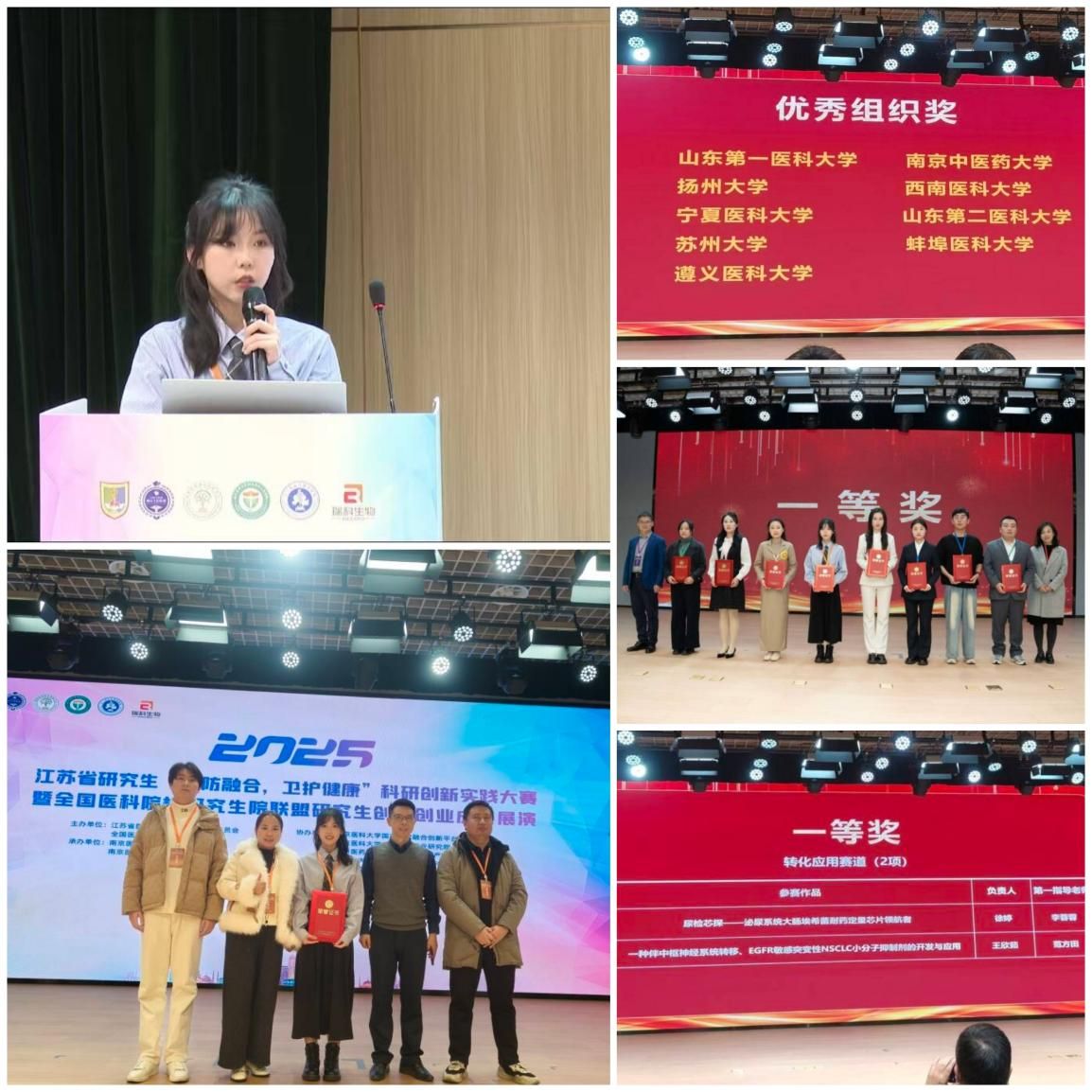 2025年12月14日,由江苏省医学类研究生教育指导委员会、全国医科院校研究生院联盟主办,南京医科大学承办的第四届江苏省研究生“医防融合,卫护健康”科研创新实践大赛暨全国医科院校研究生院联盟研究生创新创业成果展演成功举办。本届大赛吸引了全国多所医药卫生类高校的研究生积极参与,经过激烈角逐,蚌埠医科大学代表队在比赛中表现突出:由2024级药学专业研究生王欣茹、孙子怡、2025级药学专业研究生王朝、田朗组队完成的作品《一种伴中枢神经系统转移、EGFR 敏感突变性 NSCLC 小分子抑制剂的开发与应用》(指导老师:范方田、何其伟)在“转化应用”赛道中脱颖而出,荣获一等奖,学校获得“优秀组织奖”,展现了学校在医防融合人才培养方面的扎实成效。